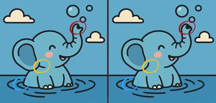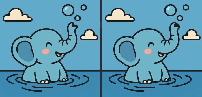 À sfrente estão d fotografias de um elefante a brincar na ág À primeira vista, parecem exatamente igs, mas isso é apenas uma ilusão. Há três pequenas diferenças escondidas nas imagens.