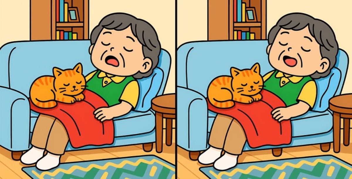 Pronto para se testar? Aqui estão d ilustrações: mostram uma mulher e um gato a dormir num sofá. À primeira vista, as cenas parecem exatamente igs, mas há três pequenas diferenças entre elas.