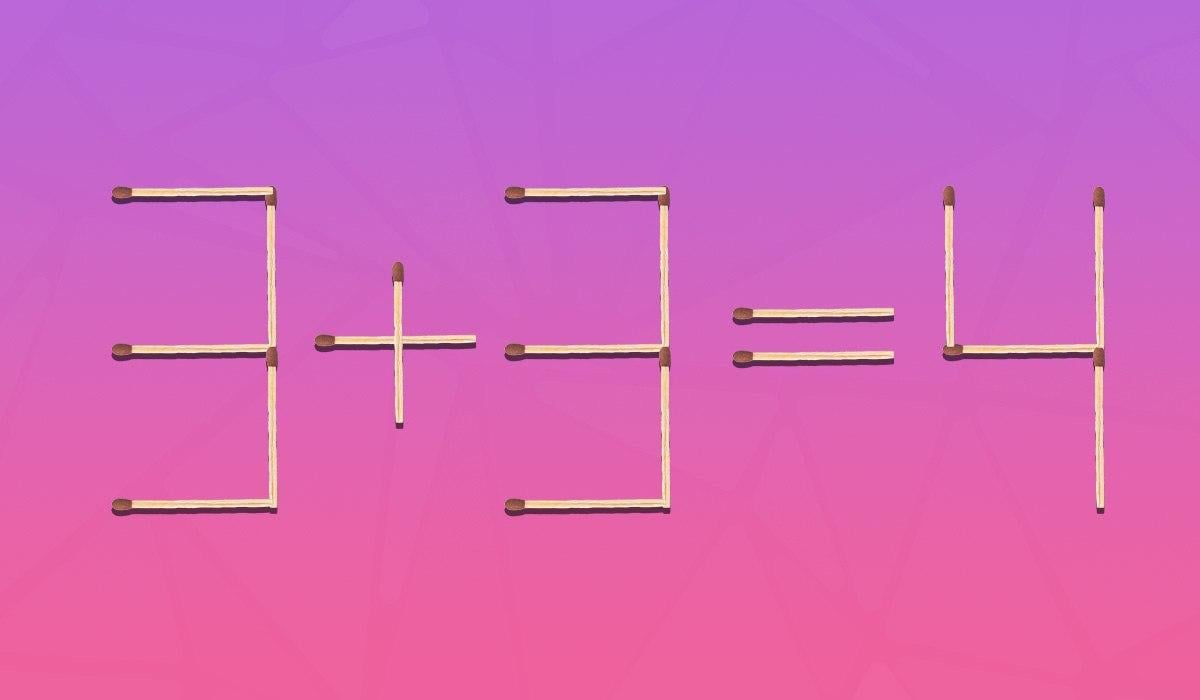 Assim, em baixo, podes ver uma imagem em que a igdade 3+3=4 é apresentada com fósforos. Do ponto de vista matemático, está incorreto, porque a resposta deveria ser seis.