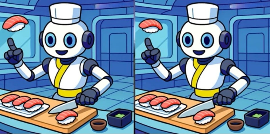 As imagens aqui apresentadas mostram um robot de sushi. À primeira vista, as d imagens parecem exatamente igs, mas há três pequenas diferenças entre elas.