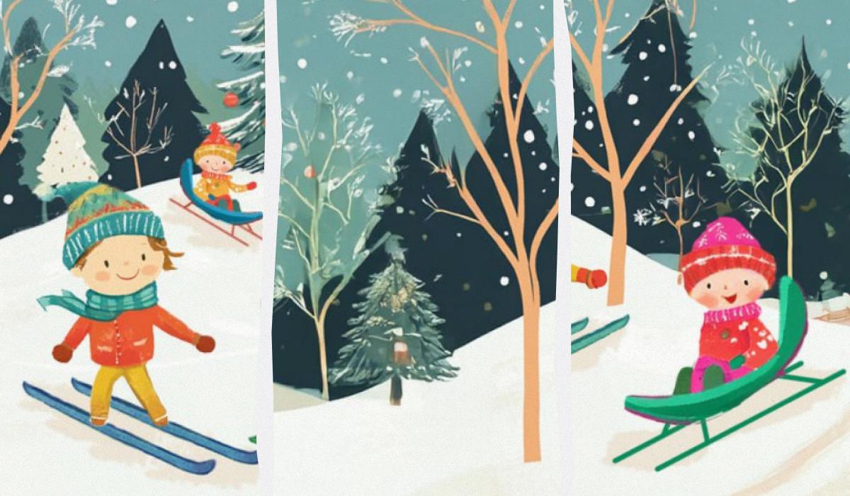 À tfrente está um grupo de crianças felizes a desfrutar da neve e do verdadeiro clima de inverno na floresta. Os mais pequenos estão a andar de trenó e os mais velhos a esquiar.