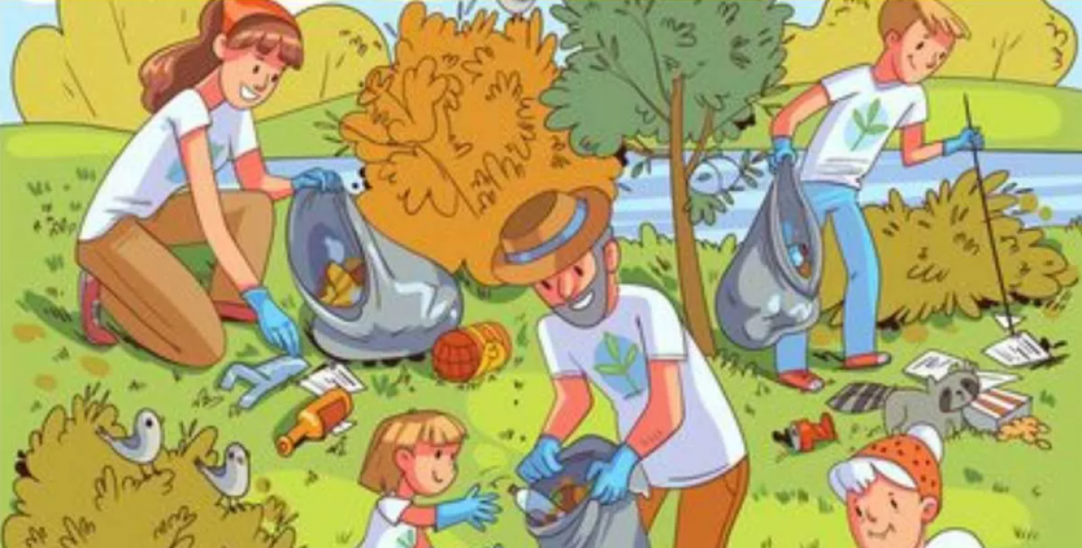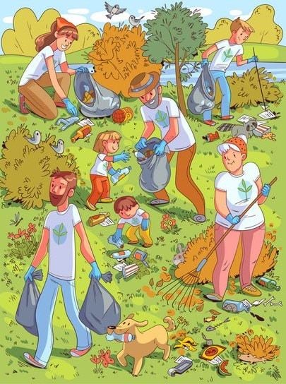 A imagem mostra famílias com crianças, que foram ao parque para limpar o lixo. Até há pássaros e um ginim a observar o que se passa. Mas tens de encontrar a tartaruga.
