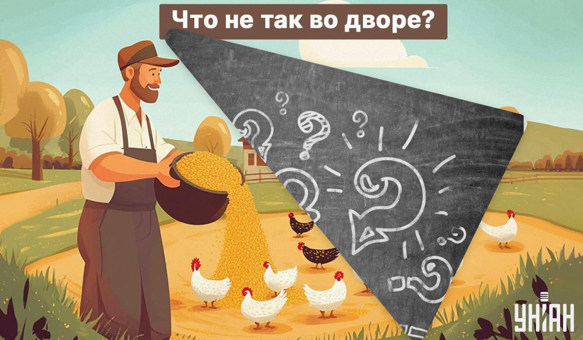 Esta imagem mostra uma quinta acolhedora com galinhas, que o proprietário alimenta com cereais selecionados. A imagem parece idílica, mas tem um erro muito grave. Divide a imagem em partes e usa o teu bom raciocínio, a textraordinária imaginação e o teu bom senso para encontrar a resposta. E lembra-te, não tens mais de 5 segundos.