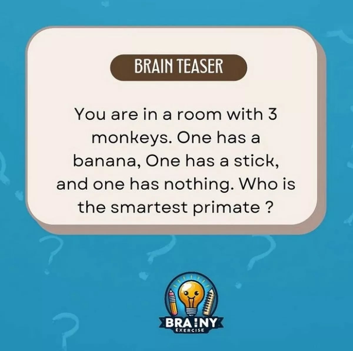 O Mirror publicou um deles, com apenas 30 segundos para resolver, e o enigma é o seguinte: “Há três macacos numa sala. O primeiro tem uma banana, o segundo tem um pau e o terceiro não tem nada. Quem é o primata mais inteligente?”
