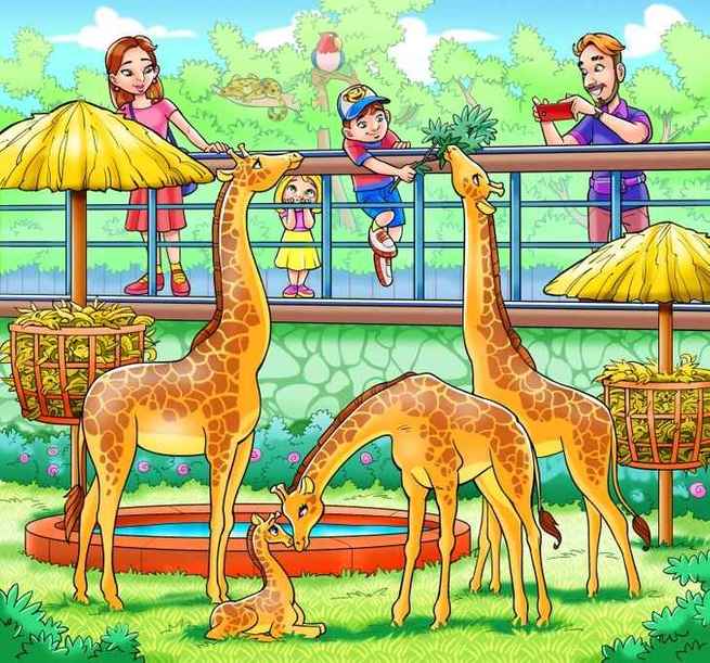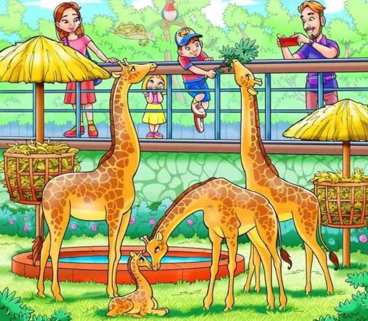 A imagem é de uma família no jardim zoológico. O homem está a filmar as girafas no seu telemóvel e as crianças e a mulher estão a observar os animais. Há um macaco escondido algures, que tens de encontrar.