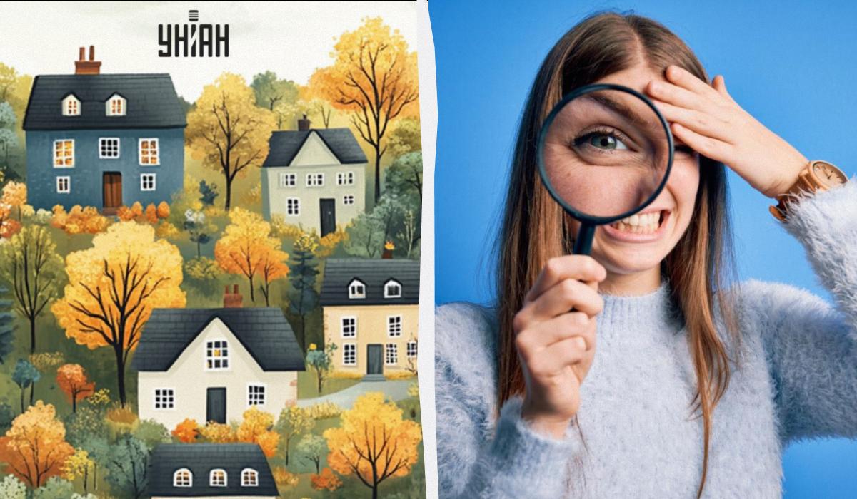 Em baixo, vê uma imagem de uma zona residencial com casas acolhedoras e árvores coloridas. A ttarefa é encontrar cegonhas no meio desta beleza.