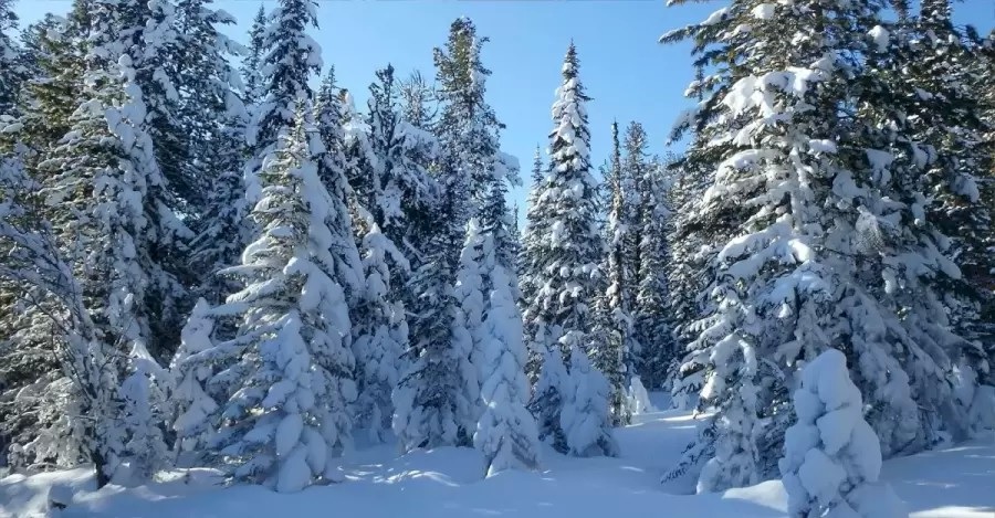A imagem mostra uma floresta de coníferas no inverno. As árvores estão tão cobertas de neve que a maior parte delas tem os ramos inclinados para baixo devido ao peso dos flocos de neve de inverno. O chão também está coberto por um espesso manto de neve.