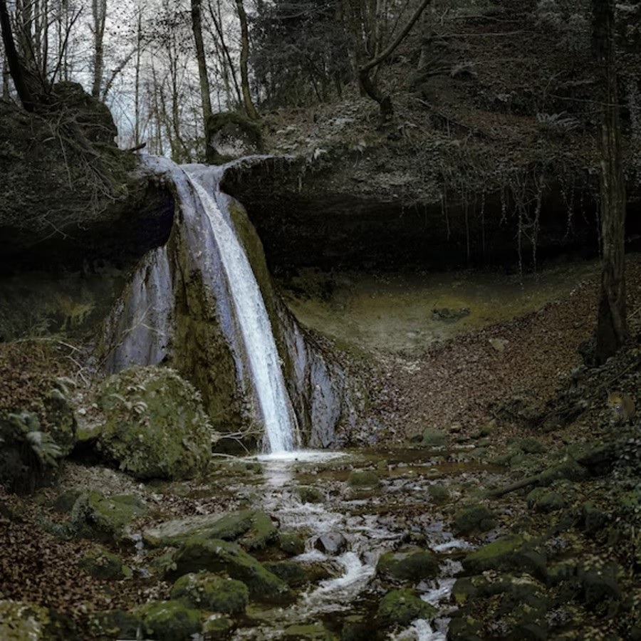 Na fotografia, vemos uma paisagem florestal com uma queda de ág A ágcai sobre as rochas cobertas de musgo que se encontram por baixo. E o esquema de cores que enqra a floresta sugere que a fotografia representa uma paisagem de outono.