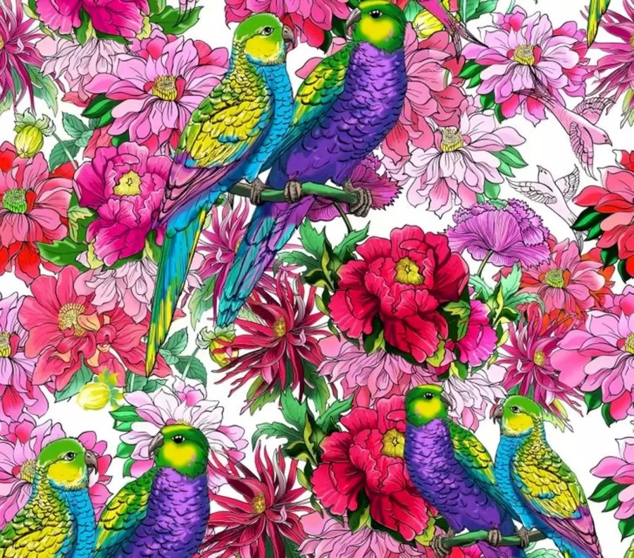 Diante dos teus olhos – um qro luminoso com muitas flores e papagaios. Os pássaros estão sentados aos pares entre as flores. E nesta atmosfera romântica há um coração escondido. Não se sabe exatamente onde está localizado.