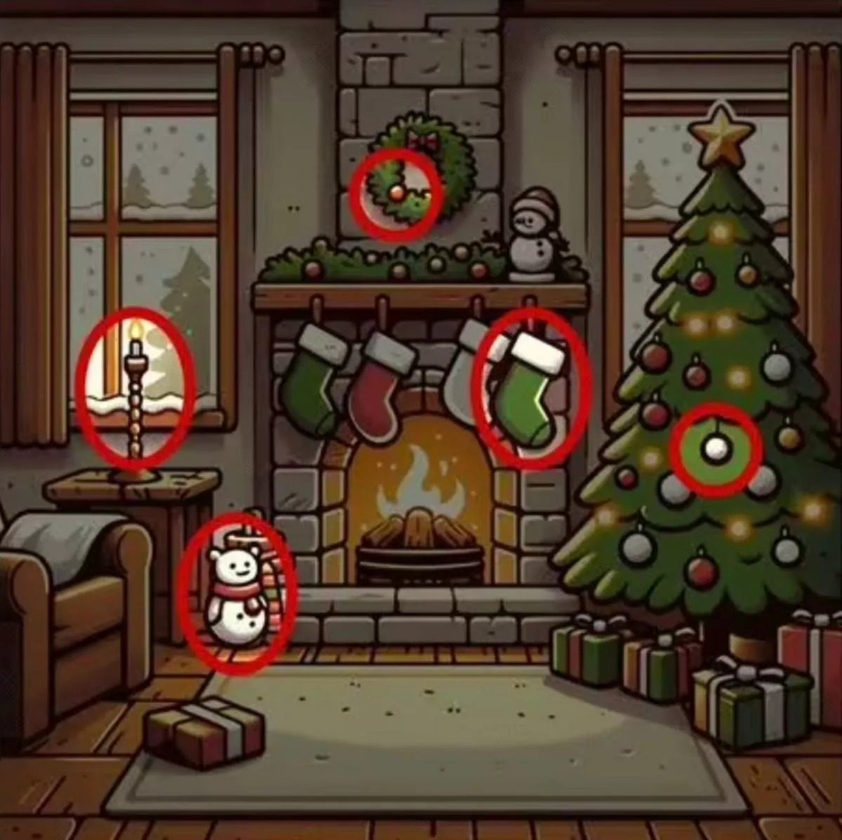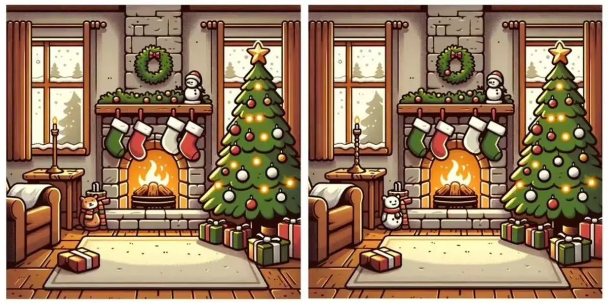 - Na fotografia da esquerda está um cão no canto junto à lareira e na fotografia da direita está um boneco de neve;