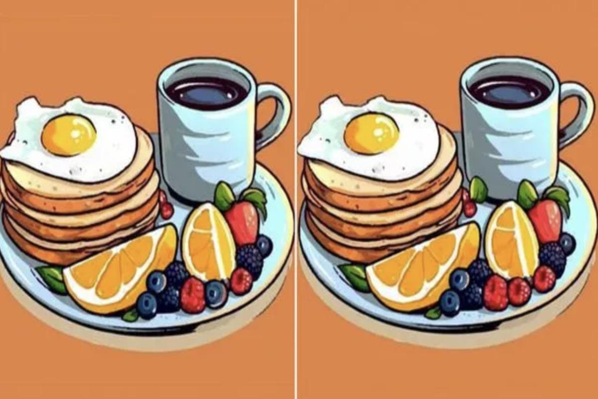 Num novo jogo de puzzle que faz algumas pessoas quebrar a cabeça, tens de encontrar três diferenças entre dois pratos de pequeno-almoço, que contêm panquecas, ovos e fruta. Ao lado destes pratos está uma caneca de café para acompanhar tudo.