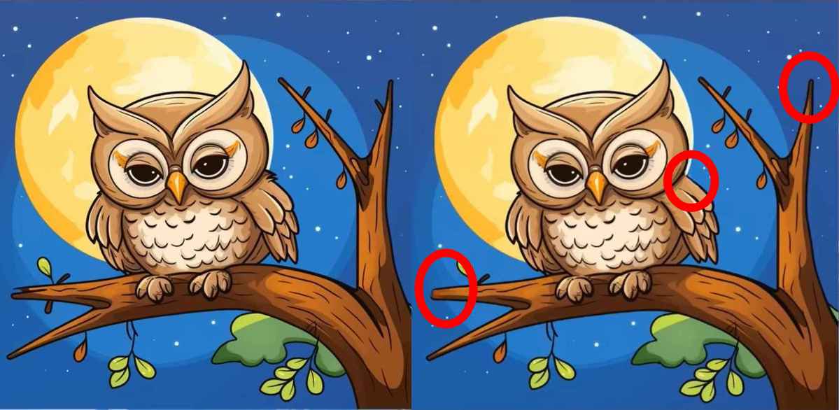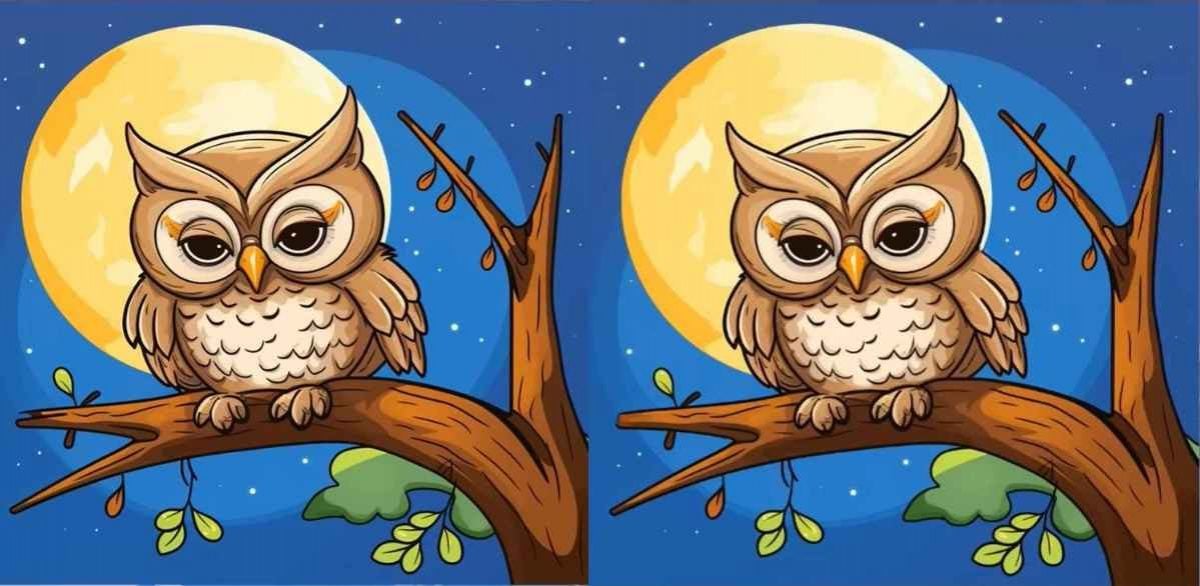 À sfrente estão d imagens de uma coruja numa árvore. À primeira vista, parecem ser exatamente igs, mas não são – há três diferenças subtis escondidas entre elas.
